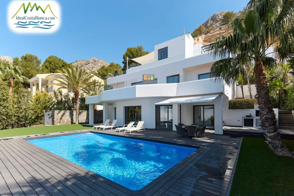 Esta impresionante propiedad, situada en una parcela de 913 m2, ofrece un estilo de vida único en una de las zonas más prestigiosas de la Costa Blanca. Con una superficie construida de 475 m2 distribuidos en 4 niveles, uno de ellos diseñado especialmente para invitados, la villa garantiza privacidad y comodidad para todos sus residentes. Un ascensor conecta todos los pisos de esta elegante vivienda.~~Planta de entrada:~Incluye un elegante vestíbulo, un parking exterior con capacidad para dos vehículos y un garaje cerrado para un coche, equipado con cargador para vehículos eléctricos.~~Planta -1 (nivel para invitados):~Dispone de una cocina, salón, un dormitorio, dos baños y una gran terraza. La superficie total es de 125 m2, diseñada para ofrecer un espacio independiente y funcional.~~Planta -2:~Cuenta con 3 dormitorios con armarios empotrados, 3 baños y acceso a una amplia terraza.~~Planta -3:~Se encuentra un dormitorio, 2 baños y un amplio salón-comedor con cocina americana completamente equipada. ~~En total, la villa dispone de 5 dormitorios y 7 baños, ofreciendo espacios amplios y confortables para todos los miembros del hogar. ~~Construida en 2013 y completamente renovada a principios de 2024, esta villa incorpora mejoras estructurales, interiores y tecnológicas, como suelo radiante, aire acondicionado central y un sistema avanzado de "SMART HOME", la propiedad combina lujo y tecnología moderna. Dispone además de cerraduras eléctricas en las puertas de entrada y en el acceso al garaje, persianas électricas, paneles solares para calentar el agua, una caja fuerte empotrada y un sistema de alarma que garantizan un entorno seguro y eficiente.~~El exterior impresiona con amplias terrazas, un jardín con árboles frutales, una piscina con iluminación de colores y una zona de barbacoa, que crean el espacio ideal para relajarse y disfrutar del clima mediterráneo.