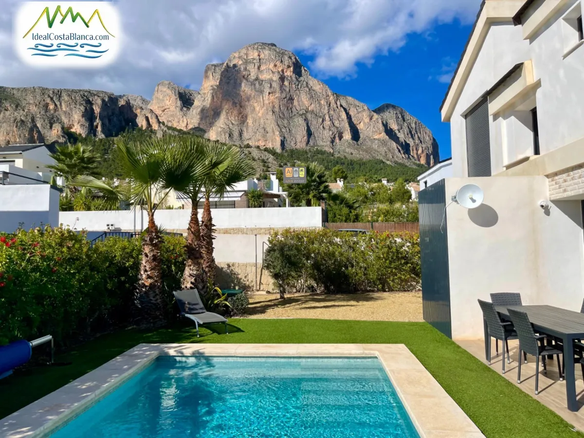 Descubre esta elegante villa contemporánea situada al pie del monte Ponoig, en una urbanización cerrada y tranquila, rodeada de naturaleza. Un entorno privilegiado que combina paz, privacidad y unas vistas impresionantes tanto al mar como a la montaña.~~La vivienda, distribuida en dos plantas, destaca por su diseño moderno y luminoso.~En la planta principal se encuentra un amplio salón con grandes ventanales, un comedor acogedor y una cocina americana totalmente equipada con electrodomésticos de alta gama. Desde el salón y la cocina se accede directamente al exterior, ideal para disfrutar de comidas al aire libre.~En esta misma planta hay un dormitorio con zona de vestidor, salida a la terraza y un baño completo.~~En la planta superior se ubican dos dormitorios con baños en suite, uno de ellos con acceso a una terraza privada con vistas panorámicas al mar y a la montaña.~~El exterior de la villa está cuidadosamente diseñado para ofrecer el máximo confort y bienestar. Dispone de una piscina climatizada de 32 m2, perfecta para disfrutar en cualquier época del año, una zona de comedor con barbacoa ideal para reuniones familiares o con amigos, una acogedora área de relax donde descansar y disfrutar del sol, así como césped artificial de fácil mantenimiento, que aporta un toque verde y elegante al conjunto. Todo el espacio exterior ha sido pensado para vivir al aire libre y aprovechar al máximo el clima mediterráneo.~~Una propiedad perfecta tanto para vivir todo el año como para disfrutarla como residencia vacacional.~Diseño, confort y naturaleza en perfecta armonía.~~Contáctanos para más información o concertar una visita~Precio negociable.