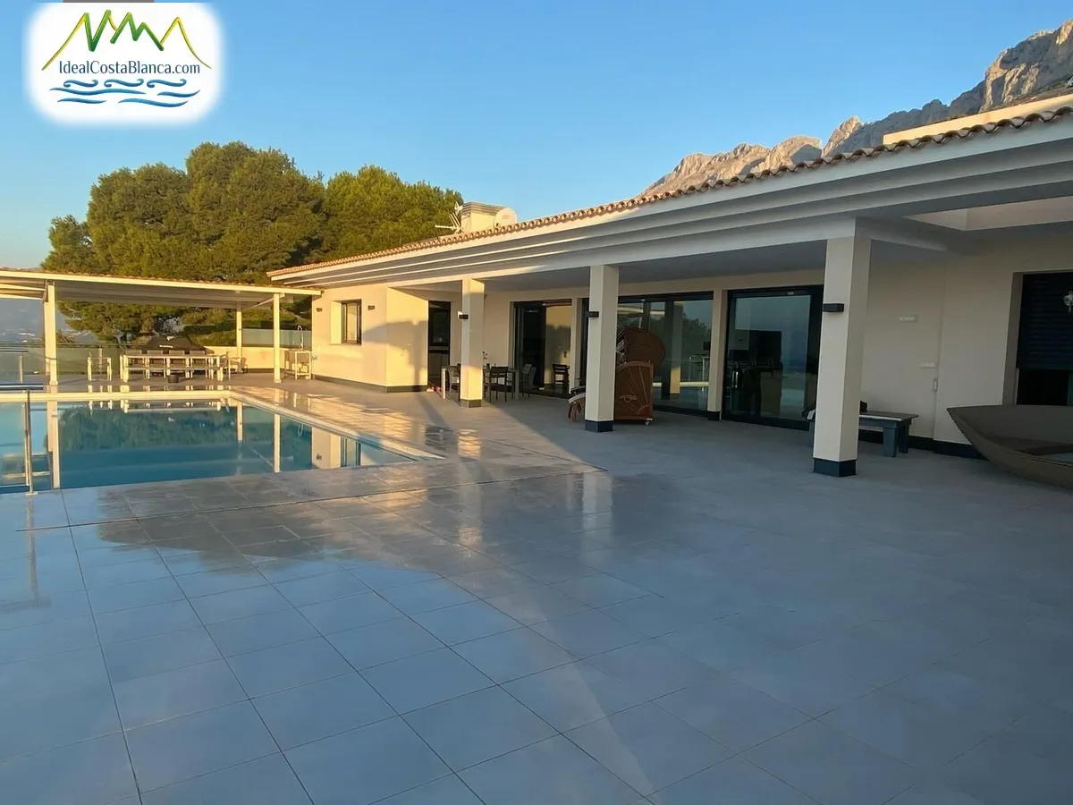 Espectacular chalet en la sierra de Bernia, frente al mar con vistas de 360* y una piscina infinita. ~Se distribuye en 2 plantas . Accedemos a la casa a pie de calle por la puerta principal. Entramos en el salón, y a la derecha queda el comedor y la cocina abierta. Con un ventanal desde donde podrás ver la piscina y el mar, desde los tres espacios. Cocina abierta con isla, muebles bajos y electrodomésticos integrados, puro diseño y comodidad. Desde el ventanal salimos a la terraza, con cenador y jacuzzi cubiertos y la piscina infinita que domina el espacio.